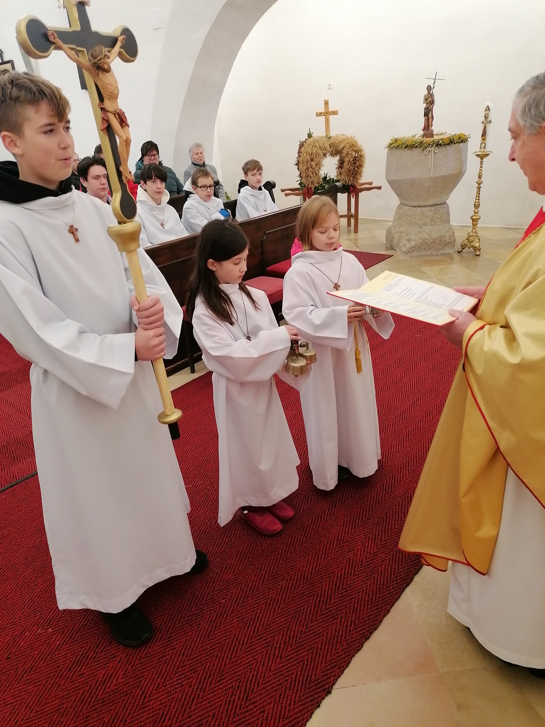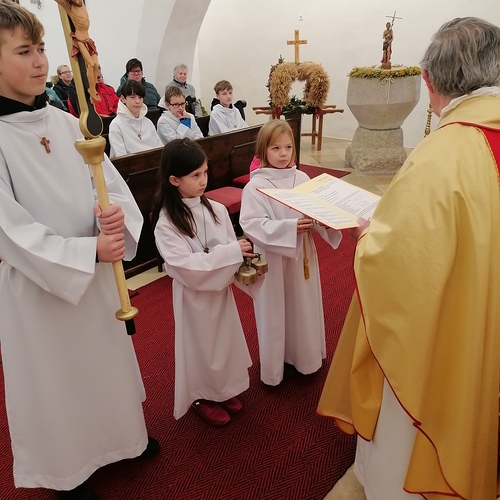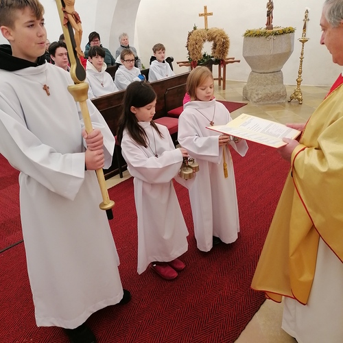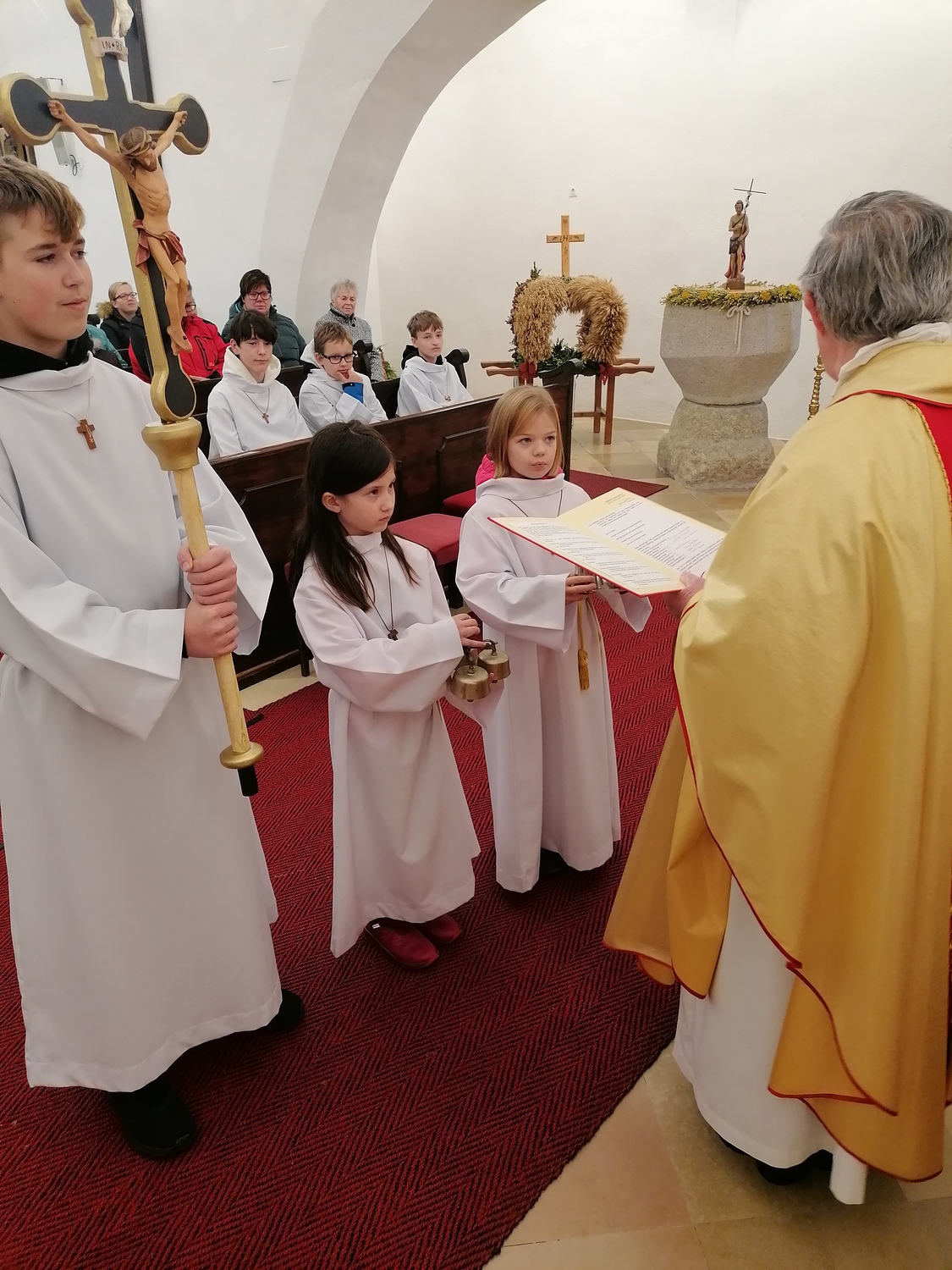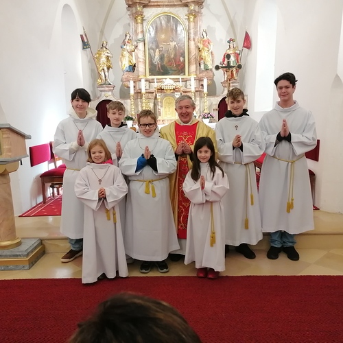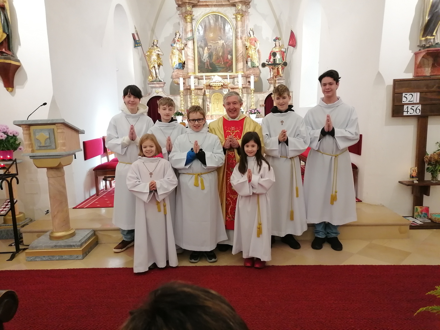 Pfarrer Peter Rückl freute sich besonders, über den Zugang von vier Ministranten-innen, die in diesem Jahr ihren Dienst am Altar begonnen haben und seitdem mit Freude zur Messfeier kommen. An diesem besonderen Tag durften die "Minis" auch die Fürbitten vortragen. Pfarrer Rückl bedankte sich auch ganz herzlich bei den Eltern, die ihre Kinder animieren und unterstützen. Der Chor "Drüber und Drunter" umrahmte die Hl. Messe musikalisch.