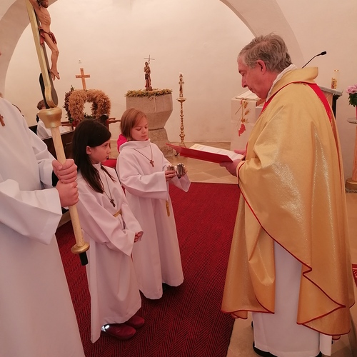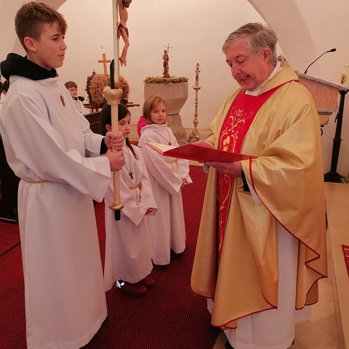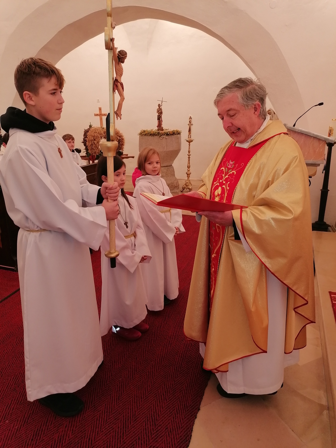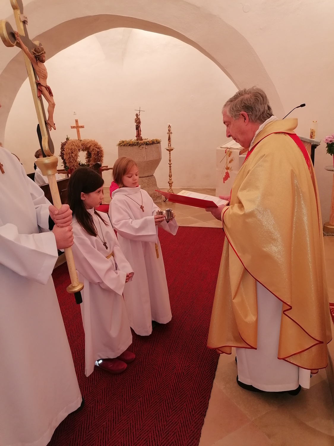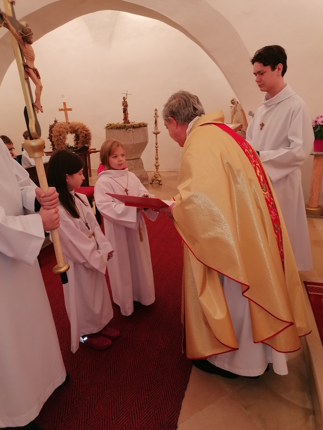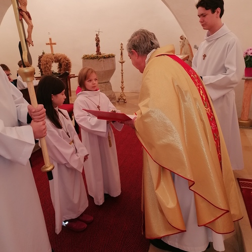 Pfarrer Peter Rückl freute sich besonders, über den Zugang von vier Ministranten-innen, die in diesem Jahr ihren Dienst am Altar begonnen haben und seitdem mit Freude zur Messfeier kommen. An diesem besonderen Tag durften die "Minis" auch die Fürbitten vortragen. Pfarrer Rückl bedankte sich auch ganz herzlich bei den Eltern, die ihre Kinder animieren und unterstützen. Der Chor "Drüber und Drunter" umrahmte die Hl. Messe musikalisch.