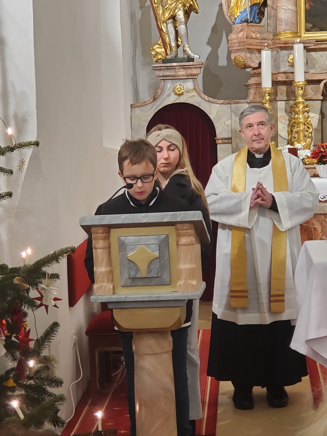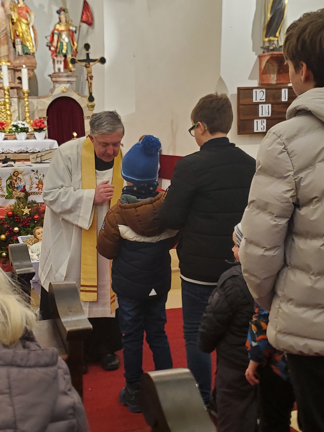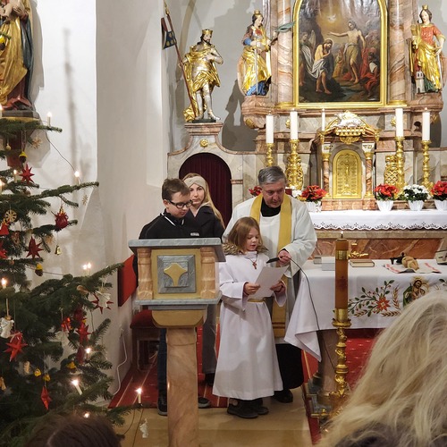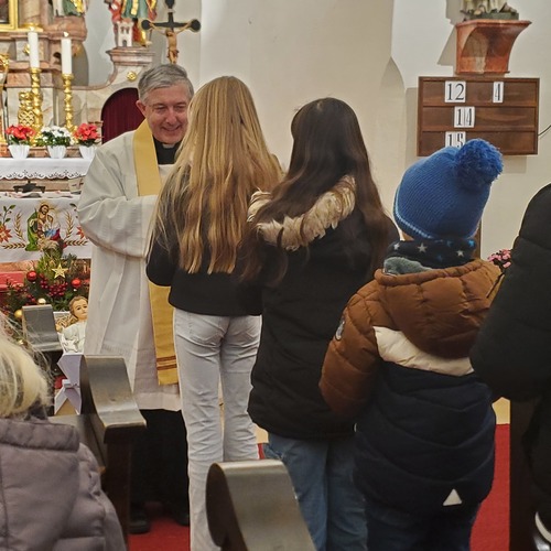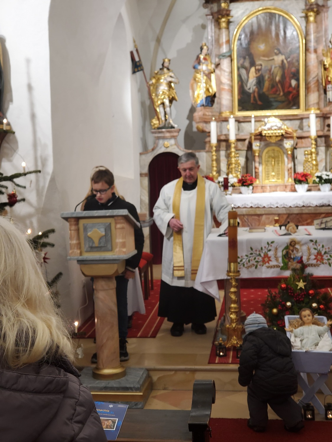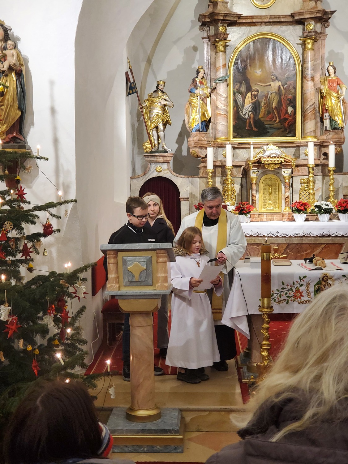 Kinder und Jugendliche aus der Pfarre gestalteten die Andacht mit Pfarrer Peter Rückl, welcher anschließend den besonderen Christkindlsegen den Anwesenden spendete.