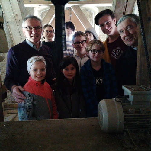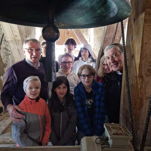 Am Foto unsere fleißigen Minis mit Pfarrer Rückl und Diakon Dornhackl, in der Fotomitte der Klöppel der grossen Glocke.