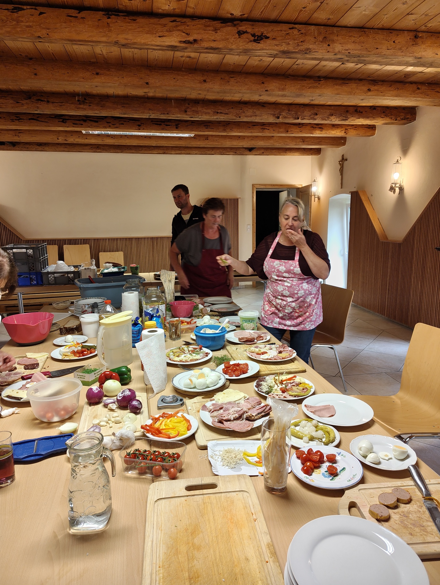 PGR-Obfrau Grete Fichtinger und ihr Team bereiteten verschiedene Spezialitäten vor, wie Z.B. köstliche Aufschnitte, belegte Brote, Aufstriche, aber auch Mehlspeisen und Getränke . Das Ambiente im Pfarrstadl genossen zahlreiche Besucher. Im Pfarrhofkeller wurden Weinspezialitäten angeboten.